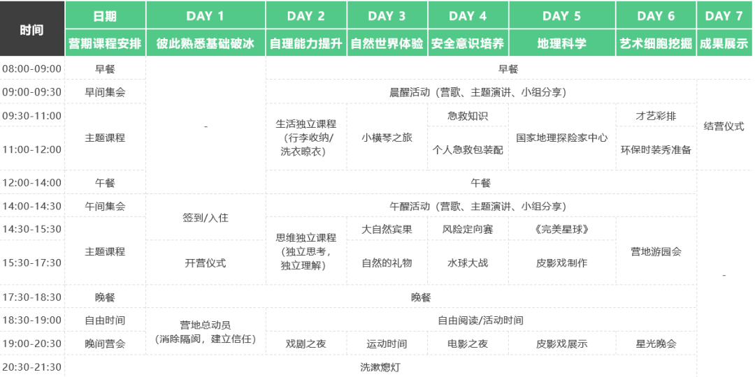 营期费用包括在营期内的导师、课程设计、餐饮、住宿、保险、交通、星奇塔无动力世界门票、国家地理探险家中心门票费用;不含往返基地交通费用及其他个人费用。
